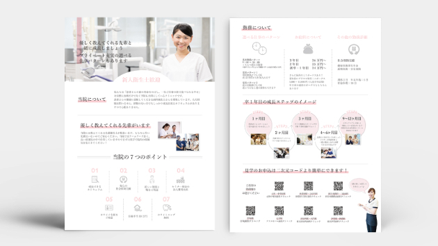 衛生士と医師の求人でカラーを変えつつ、医院の雰囲気や魅力が伝わるようキャッチコピーや写真を多く使用しています。また淡いカラーをアクセントにホワイトを活かした清潔感の感じられるシンプルなデザインです。