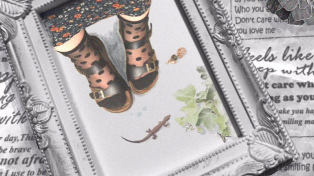 この画像では、背景の紙の写真、花の写真2点、写真フレーム、人物、イヤリング、トカゲ&植物の7個の画像で制作しました。