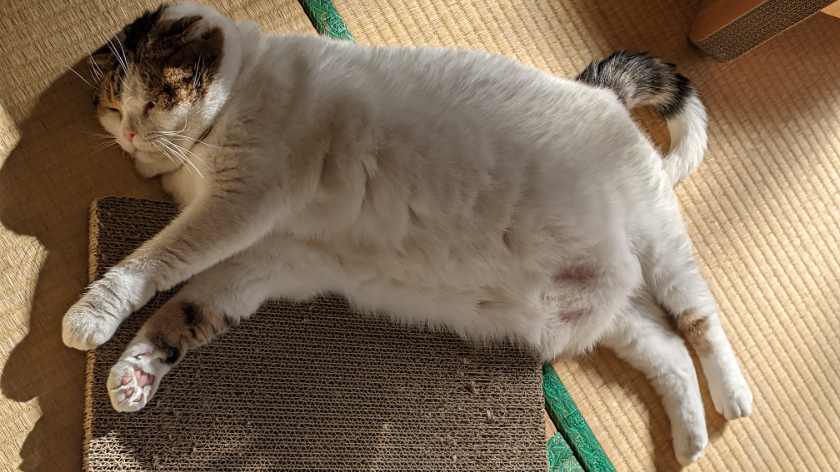 温かいのかなーと思って三毛柄を撫ぜるとあっつ、これは熱すぎるだろーとおもう程の毛の熱さです。