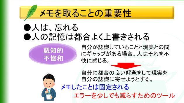 一方、メモをしたことはそこに固定されます。人の特性によるエラーを少しでも減らすためのツールがメモです。ただしメモを取ることには一定の労力の時間が必要です。トレーナーはその時間を作ってあげる必要があります。