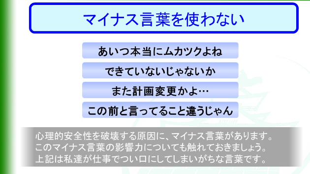 心理的安全性を破壊する原因に、マイナス言葉があります。このマイナス言葉の影響力についても触れておきましょう。上記は私達が仕事でつい口にしてしまいがちな言葉です。