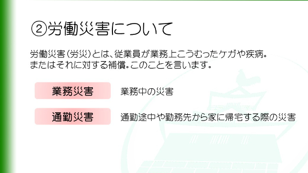 もう一つは通勤災害で、通勤途中や勤務先から家に帰宅する際の災害を言います。