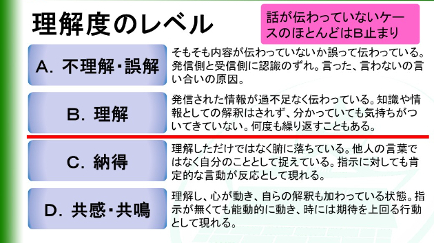理解しただけではなく腑に落ちている。他人の言葉ではなく自分のこととして捉えている。なるほど、確かにという気持ち。指示に対しても肯定的な言動が反応として現れる。
