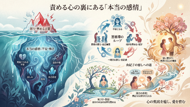 パートナーを責めてしまう背景には、「不安」や「自己防衛」があることが多い。過去の傷や、関係が壊れることへの恐怖が、責めるという形で現れてしまう。