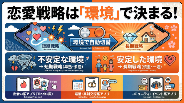 まるでスマホが位置情報をもとに設定を最適化するように、人間の脳と体も、環境データをもとに配偶戦略を最適化しているわけです。