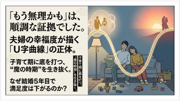 この曲線は、「結婚したら幸せが続く」という理想とは全く違う。むしろ、多くの夫婦が中盤で「こんなはずじゃなかった」と感じる時期を経験するのが普通なのだ。