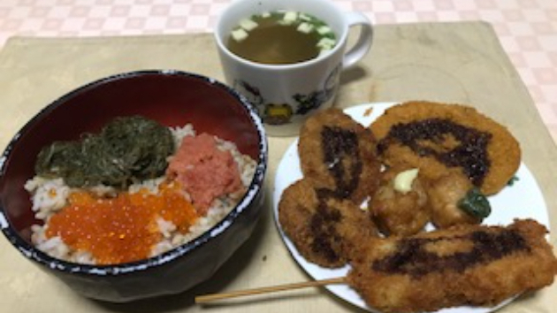 流石に揚げ物は自作じゃなくて、お惣菜で買った奴なんですけど