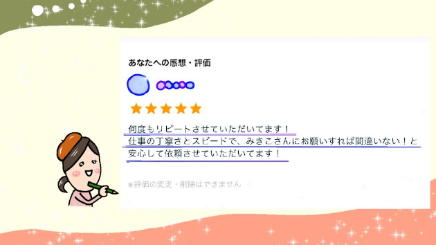 仕事の丁寧さとスピードで、みきこ様にお願すれば間違いない!