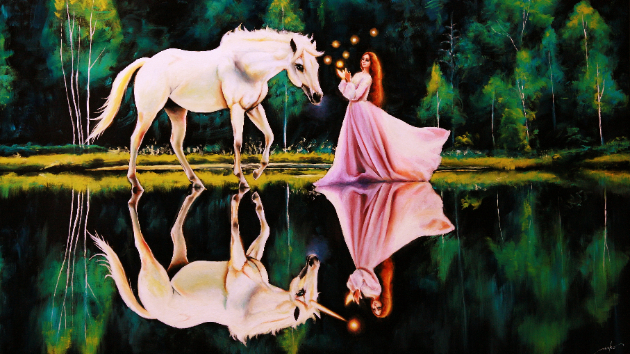 The white horse encounters the goddess at a blue lake, and evolves into the unicorn.