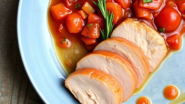 トマトと白ワインで煮込むことで、豚肉が柔らかくなり、深い味わいが出ます。地中海風のハーブが香る一品。