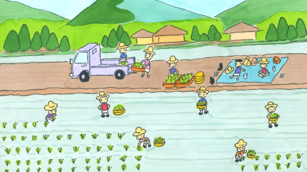 今回のイラストは、田植えをする少年たちを描いてみました。