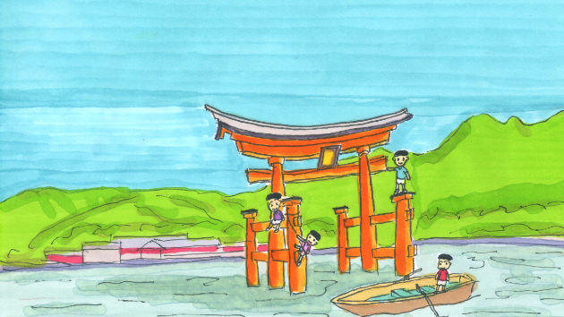 今回のイラストは、宮島を楽しむ少年たちを描いてみました。