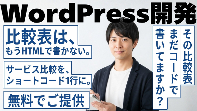 この度は私が開発いたしました軽量のプラグインについて、ご紹介させていただきます。WordPressサイトにおいて、複数のサービスや商品を一覧で比較し、訪問者にわかりやすく情報を伝える比較表は、コンバージョン向上において重要な役割を果たしております。しかしながら、比較表を設置するには、通常、HTMLやテーブルタグを直接編集する必要があり、専門知識のない方にとっては容易な作業とは言えません。本記事では、WordPressの投稿や固定ページに、簡単なショートコード1つで比較表を設置でき、かつログイン時にはサイト上から直接編集・列追加が可能となる「比較表ショートコード」の機能と利点について、ご説明させていただきます。