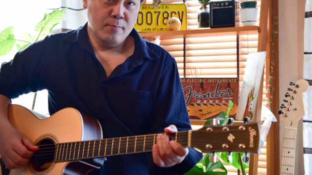 アコースティックギターやエレキギターを座った姿勢で練習するときの持ち方になります。