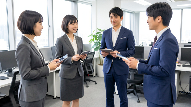 男子社員2名と女子社員2名がタブレットで社内打ち合わせ画像