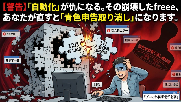 その「崩壊したfreee」、素人の知識で直そうとすると、傷口を広げて「青色申告取り消し」になります。 絶対に、そのまま触らないでください。