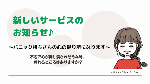 こんにちは、YUSAKODAです。新サービス開設のお知らせです♪(^^)パニック持ちさんの【心の拠り所】になります。不安...