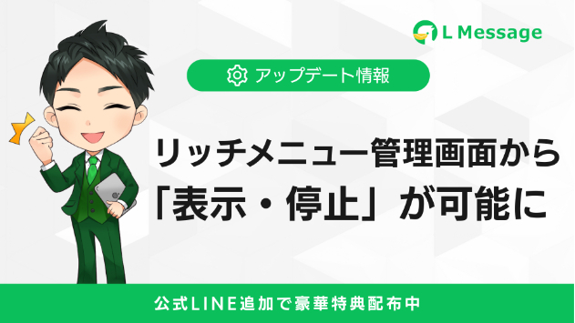今回のアップデートでは、リッチメニューの表示・停止をリッチメニュー管理画面から直接行えるようになりました。