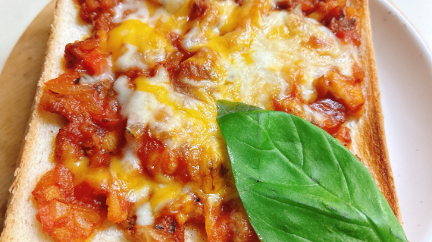 上のパンには、具材を足してアレンジしたミートソースをのせて。