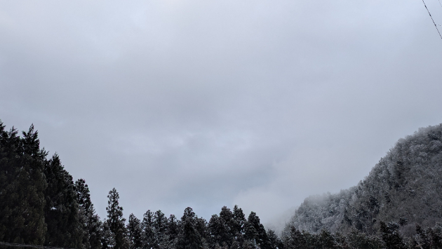 今日も、雪が残る山の景色に癒されながら