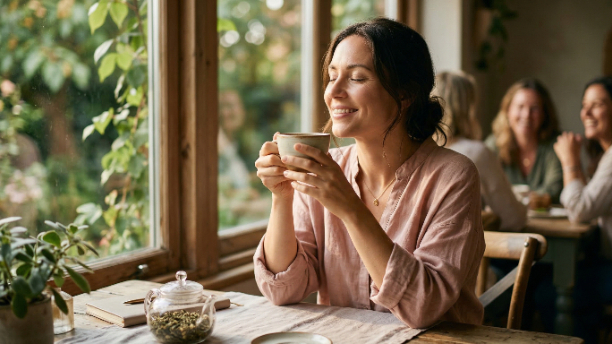 ・日の光が差し込むテーブルで、女性がホッと一息ついている写真