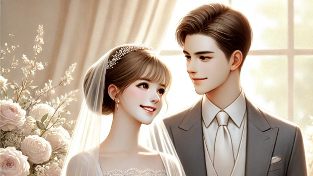 DALL·E 2025-12-08 13.46.46 - A beautiful and elegant wedding scene featuring a bride and groom on their wedding day. The couple stands close together, smiling happily and looking .jpg