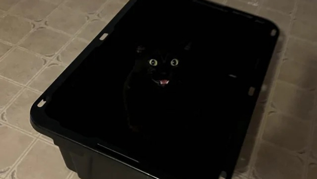 本投稿は、黒いプラスチック製の収納ボックスの中に隠れている黒猫の写真で、猫の目と少し見える口だけが暗闇に浮かび上がっている様子を撮影したものです。猫が完全に背景と同化し、まるで「カモフラージュの達人」のような状態を示しており、ユーモラスで愛らしい瞬間を捉えた投稿として話題となりました。