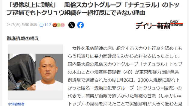 デイリー新潮は2月17日、国内最大級とされる風俗スカウトグループ「ナチュラル」のトップで、流動型犯罪グループ(トクリュウ)「匿名・流動型犯罪グループ」の代表とされる木山と小畑寛昭容疑者(40)が、東京都暴力団排除条例違反の疑いで1月26日に逮捕されたと報じた。女性を風俗店に紹介するスカウト行為の見返りとして、暴力団幹部にみかじめ料を支払った疑い。警察は組織実態の解明を進めている。