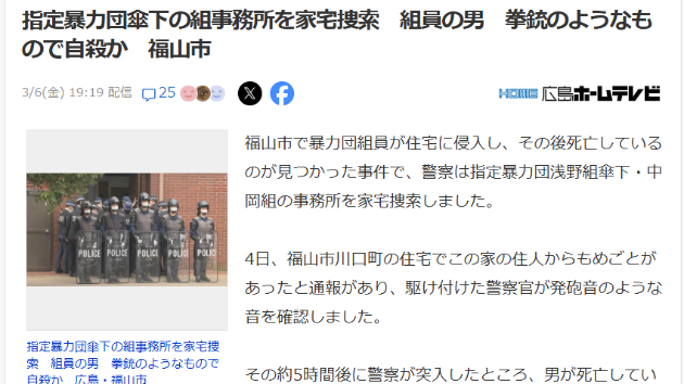 広島県福山市で、暴力団組員が住宅に侵入した後に死亡しているのが見つかった事件で、警察は指定暴力団浅野組傘下・中岡組の組事務所を家宅捜索した。警察によると、4日、福山市川口町の住宅で住人からもめごとの通報があり、駆け付けた警察官が発砲音のような音を確認した。その後、約5時間後に警察が住宅に突入したところ、侵入したとみられる男が死亡しており、近くには拳銃のようなものが落ちていた。住宅の住人3人は逃げ出して無事だった。警察が詳しい経緯を調べている。