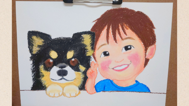 うちの子と家族が寄り添った似顔絵も描きたくてフリー素材の画像を参考に描きました。