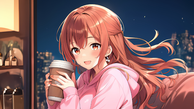 ピンクのクロップドパーカーという少しカジュアルな装いで、お気に入りのカフェで週末の最後をまったりと楽しんでいるシーンをイメージしました。