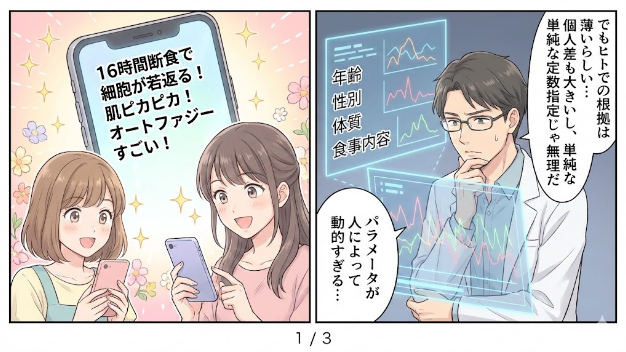 “16時間食べないとオートファジーが最大限活性化する”という話は広く知れ渡っているが、実はヒトで明確な根拠があるわけではなく、動物実験である程度確認されている程度らしい。