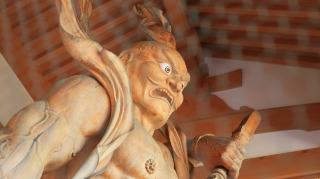 形相もさることながら二の腕に浮き出た血管がまさに満身に力がみなぎっている様子をよく表しています。手に持つ密教宝具の「金剛杵(こんごうしょ)」は「煩悩を払い、集中力を高めるために使われ」るとされます。