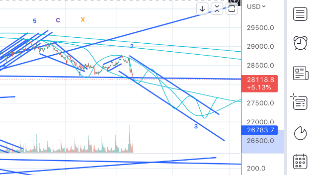 ひとまず暴落パターンに入ったと思われる。ターゲットは25000。ただ11月末くらいまでかかるのでただ下がるわけでもない。現在の値動きまで落としてくとダイアゴナルからフラットで2波が終わり3波が始まったところ。一旦28000で反発するか?