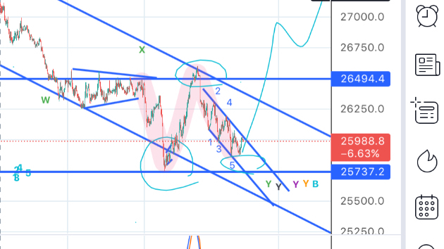 下げが修正波に見えますがエンディングダイアゴナルなら3-3-3-3-3型なのであり。ランニングフラットなら安値割らないのもあり。5波終点と仮定したところをギリギリ割ってないのであり。ウェッジになっていないがダイアゴナルは平行も拡大もあるためあり。YのCにダイアゴナルは出現するのであり。