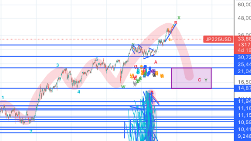 2009年から始まった上昇に対する修正と見ると修正の目安は4波の始点~終点というガイドラインがあるので21000~15000となります(紫の部分)