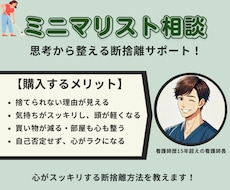 とても丁寧に対応して下さり、良かったです。 アフターフォローもして下さって助かりました! 悩み事を聞いて頂いただけでも、道筋が見えてきた感じです。 引っ越しで家の間取りが変わってしまい、置き場所に困っており、なかなか片付けが進みませんでした。 ビデオチャットで相談したり、文字だけのチャットで相談しただけでも「やろう!」という気持ちになれます。