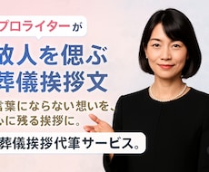 葬儀の喪主挨拶では、故人との関係だけではなく、故人が生前お世話になったことへの感謝、会葬のお礼...など伝えるべきポイントがたくさんあります。故人の冥福を祈り、参列者の方々へ感謝の気持ちを伝えるにはどんな挨拶をすべきなのでしょうか。注意すべき点やおさえるべきポイントはココナラで相談しませんか?ご希望の予算に合った相談者がきっと見つかります。クレジットカード、銀行振込、コンビニ支払い、携帯キャリア決済も対応。会員登録(無料)で300円クーポン配布中!
