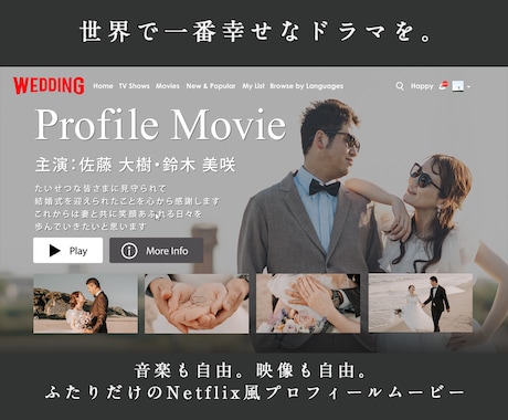 映画の予告編のような派手な演出や、二人らしいコミカルな紹介動画。ゲストの期待感を一気に高め、主役の入場を最高に盛り上げるためのインパクト抜群のビジュアルを提供します。