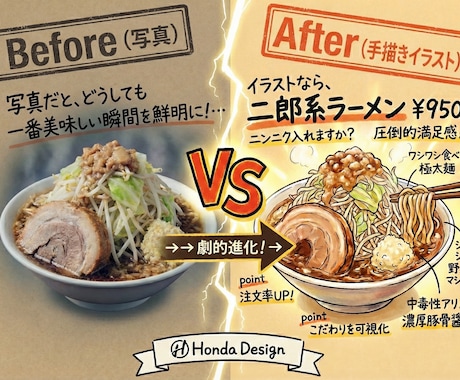 メニュー表はお店の魅力を伝える重要な装置であり、経営の要です。おしゃれなデザインにすることで、お客様に強い印象を与え、他店との差別化が図れます。また、思わず写真を撮りたくなるようなメニューはSNSでの拡散も期待でき、販促効果も抜群です。ココナラでは、お店のコンセプトにぴったりの作成をプロに依頼できます。