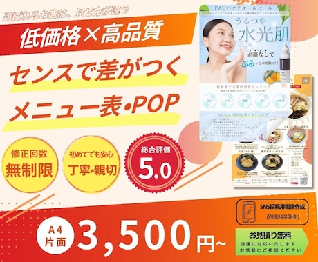 客単価を上げる売れるメニュー表をプロの技術でお特に高品質制作!実績2万件超、2,000名規模のプロから売れる構成を直接依頼できます。制作会社より安く、新商品追加等の修正対応もチャットでスピーディ。実績豊富なプロを口コミで比較して選べるから安心。見積無料、まずはチャットで店舗の魅力を最大化させましょう。