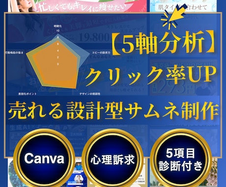 ココナラなどのプラットフォームでの出品用サムネイル。他と比較された際に際立つ「実績」や「メリット」を強調したデザインで、プロフィールへの訪問率と成約率を最大化させます。