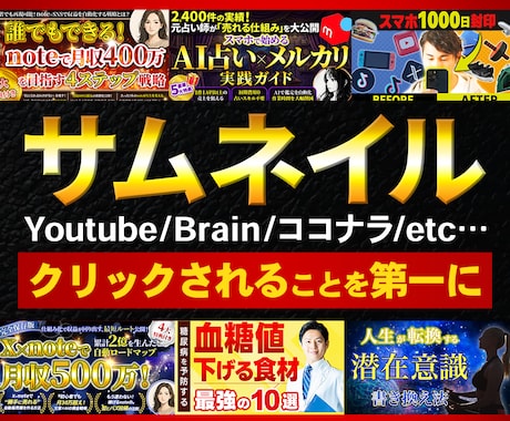 サムネイルカテゴリには実績8.0万件を誇るクリエイターが集結。スマートフォンの小さな画面でも文字がはっきり読め、かつ瞬時に内容が理解できる配色とレイアウトで、ユーザーのクリックを強力に誘発します。