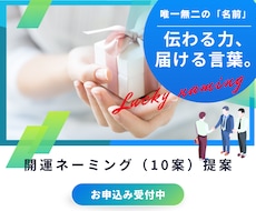 ビデオチャットでこちらの意向を丁寧に汲み取っていただき、イメージに合うようとても親身に対応してくださいました。 ネーミングの背景にあるコンセプトをしっかり理解したうえで、数多くのネーミング案をご提案いただき、とても心強かったです。 おかげさまで、やっと素敵な名前を決めることができました。 ネーミングで悩んでいる方にはおすすめしたい方です。 この度は本当にありがとうございました。