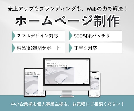 現代のWebサイトに不可欠なスマホ対応(レスポンシブデザイン)も標準で実装。どのデバイスから見ても美しく、使いやすいホームページをリーズナブルな価格で実現します。
