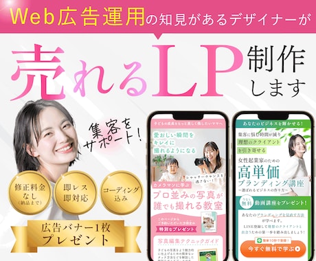 制作会社では分業されることが多い「コピーライティング」「デザイン」「コーディング」を、ココナラなら一人のプロにまとめて依頼可能。中間マージンをカットした納得の価格で、各工程がシームレスに連携した高品質なLPが手に入ります。