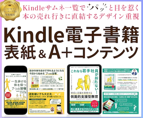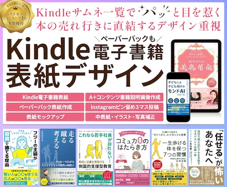 サムネイルサイズでも目を引く視認性の高いデザイン。ジャンルに合わせたフォント使いやインパクトのある配色をプロが提案。読者の興味を惹きつけ、ダウンロード数アップをサポートします。