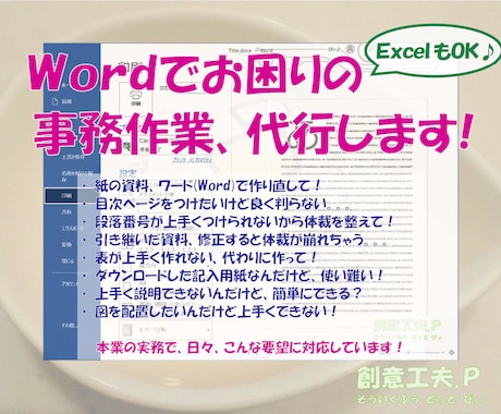 ワードのフォーマティングでかなり苦戦しており、DTPが必要かとも思っていたのですが、良心的な価格で迅速に整えていただきました。 大変迅速な対応で、作業の進め方や進捗状況までお知らせいただき、とても安心してお願いできました。 また、こちらで見落としていた文書の誤りもご指摘いただき、お願いした以上のサービスをご提供いただきました。 今後またワード、エクセル関連でまたトラブルがあれば是非お願いしたいと思います。