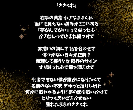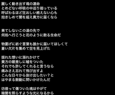 恋愛、応援歌、ダークな世界観など、テーマに合わせてストーリーを構築。リスナーの心に刺さり、共感を生む歌詞を提供します。
