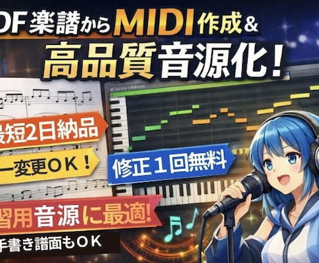 楽譜作成ソフトでデータを作り、PDF形式で納品されます。MIDIやMusicXMLでの納品も相談可能です。